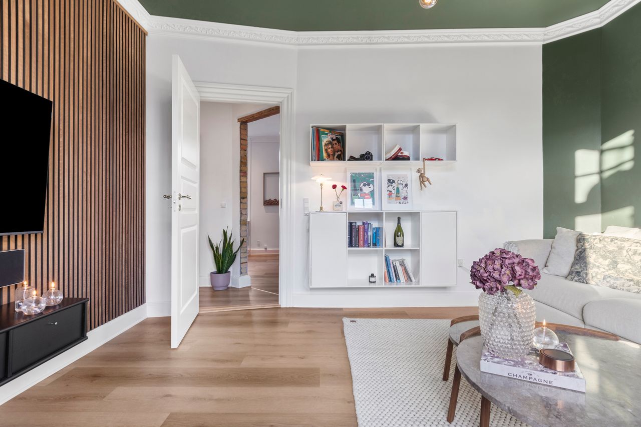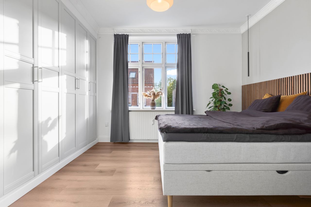 Lejligheden byder på et rummeligt soveværelse med masser af plads. De elegante indbyggede skabe giver en praktisk og stilfuld opbevaringsløsning, som samtidig frigiver gulvplads og skaber et ryddeligt udtryk. Entréen binder boligen sammen og leder videre til et smagfuldt renoveret badeværelse fra 2024 med nyt støbt gulv, behagelig gulvvarme og opdaterede installationer. De seneste år er lejligheden blevet opgraderet med blandt andet sænkede lofter med spots, filtede vægge, nye massive døre og moderne klikgulve med indbygget korklag, hvilket tilsammen skaber en lys, varm og indbydende atmosfære. Samtidig er enkelte originale detaljer bevaret og nænsomt frisket op, hvilket giver boligen et charmerende og tidløst udtryk.