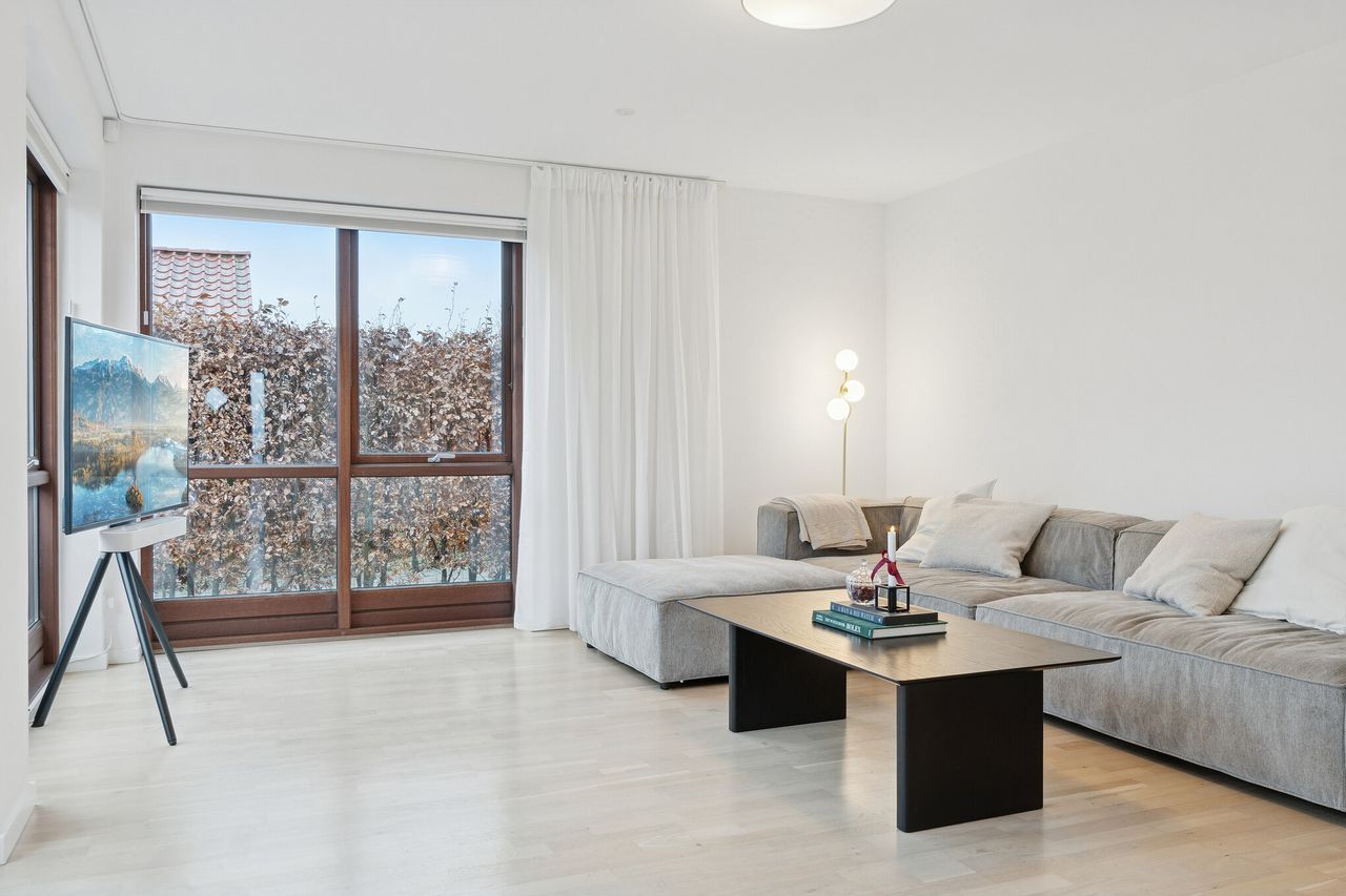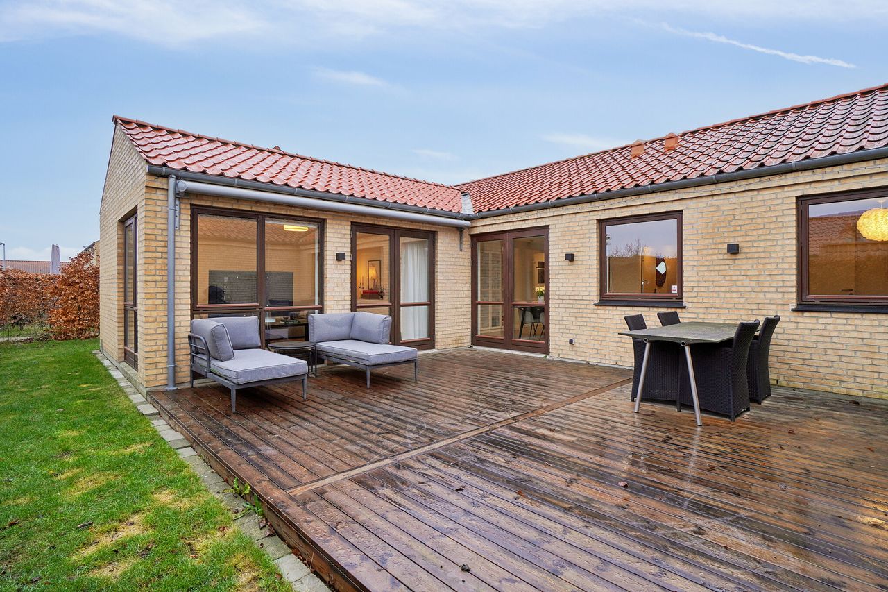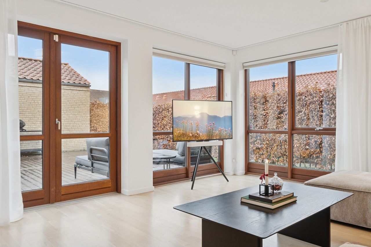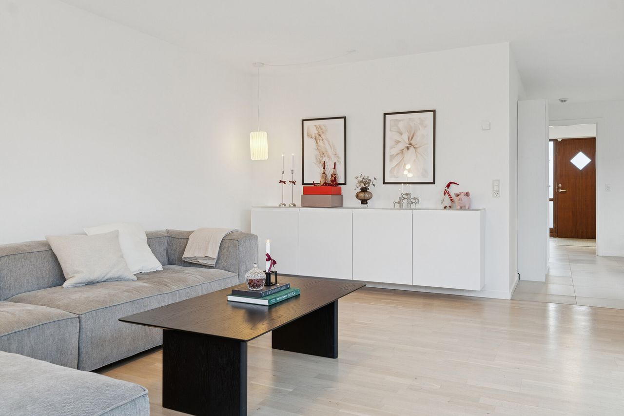 I bydes først velkommen i en praktisk entré. Herfra er der adgang til et af boligens værelser, som har eget walk-in-closet og tilhørende badeværelse. På den modsatte side af entréen ligger boligens andet badeværelse. Fra entréen træder I videre ind i boligens hjerte: et lyst og åbent køkken-alrum, hvor vinduespartierne sikrer et flot lysindfald og en behagelig fornemmelse af rummelighed. Køkkenet er praktisk indrettet og har god skabs- og bordplads, mens alrummet uden problemer rummer et spisebord. Herfra er der direkte udgang til en træterrasse, hvor I kan nyde solen i læ og fredelige omgivelser. I forlængelse af alrummet ligger stuen, som ligeledes har adgang til terrassen. Den åbne forbindelse mellem alrum og stue skaber et naturligt samlingspunkt. Boligen rummer yderligere to gode værelser, der kan indrettes som børneværelser, kontor eller hobbyrum. Hertil kommer et praktisk bryggers med egen indgang.
