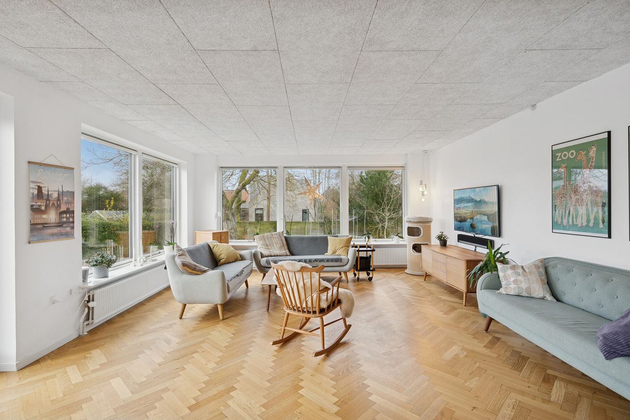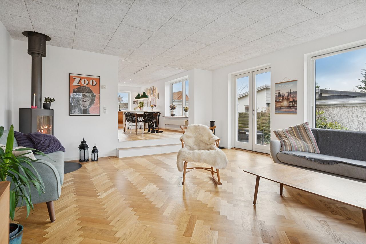 Ved ankomst træder I ind i en åben entré, der giver adgang til to gode værelser – det ene er i dag anvendt som forældresoveværelse, det andet som kontor – samt et gæstetoilet og indbygget skabsplads. Fra entréen fortsætter I ind i et flot, moderniseret køkken, som ligger i åben forbindelse med alrum og en stor, lys stue. Det sammenhængende opholdsrum fremstår både smagfuldt og moderne med smukke sildebensparketgulve og troldtektloft, der bidrager til en behagelig akustik. Her er god plads til både hverdag og gæster, og om sommeren kan I herfra nemt træde direkte ud til en hyggelig terrasse.