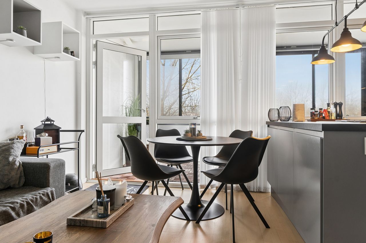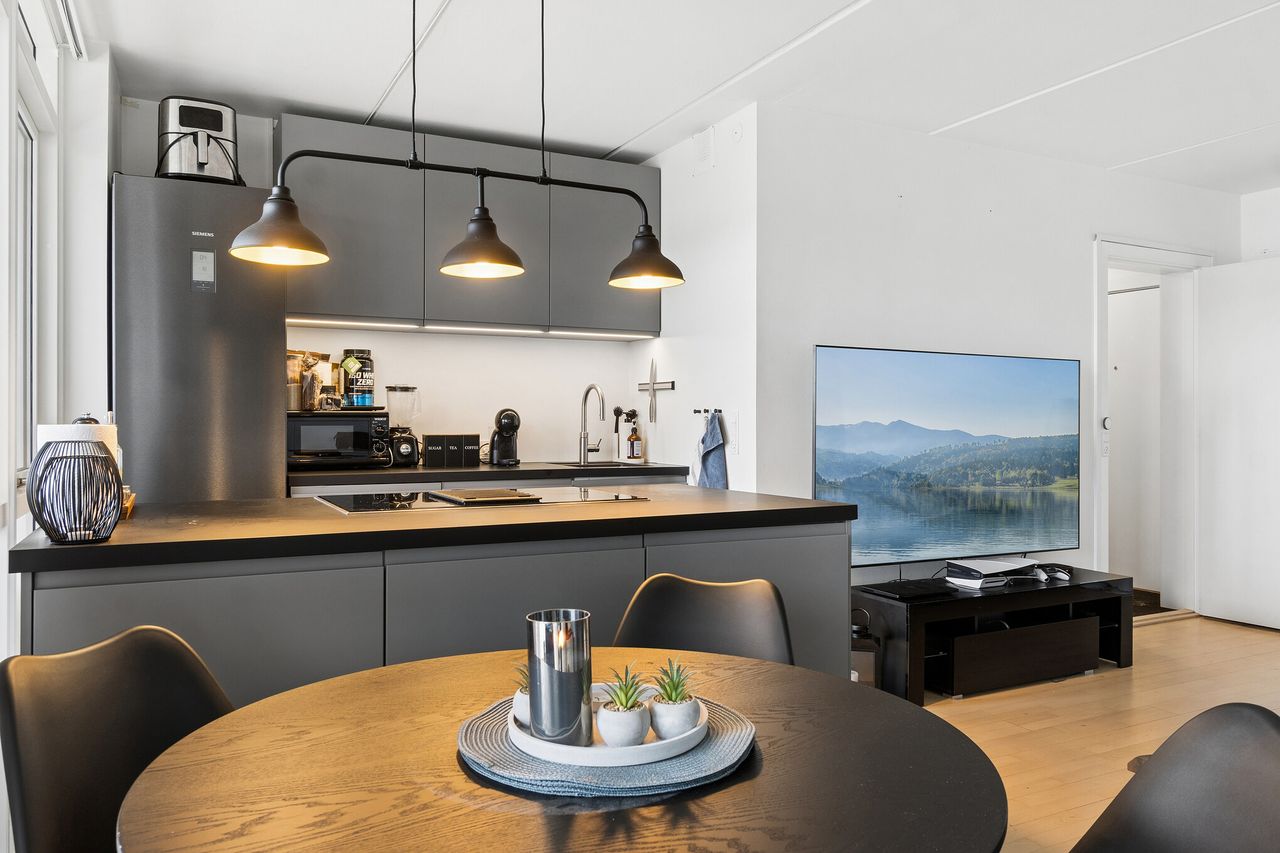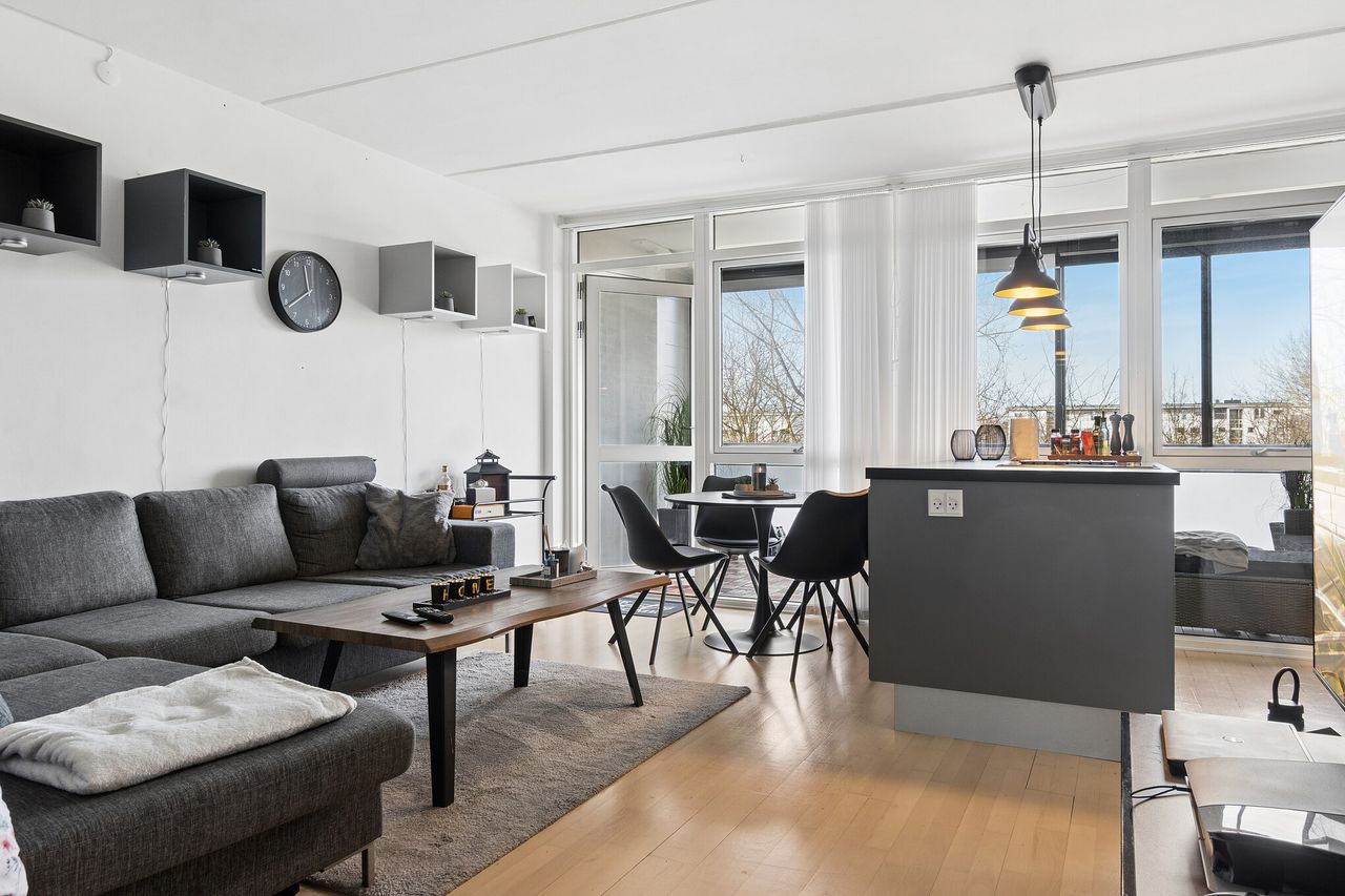 Lejligheden rummer 43 m² og fremstår lys, moderne og veludnyttet. Køkkenet er virkelig flot og fungerer som boligens naturlige samlingspunkt med en stor, indbydende køkkenø, der giver både ekstra arbejdsplads og mulighed for spiseplads. Køkkenet ligger i åben forbindelse med opholdsrummet og skaber et rummeligt og sammenhængende leverum med et stilrent udtryk.
