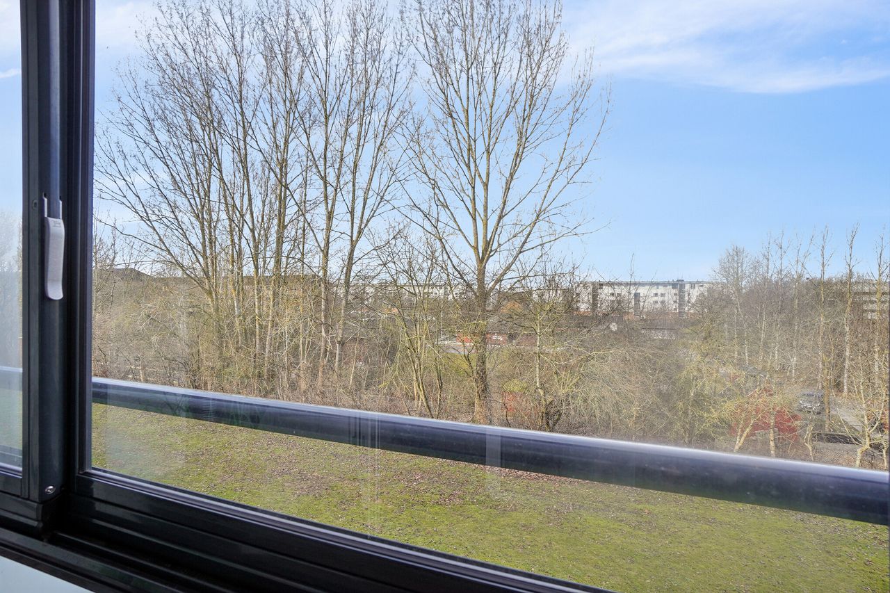 Fra opholdsrummet er der direkte adgang til den store, lukkede altan. Lejligheden ligger i en af de bedst beliggende blokke i foreningen med frit og ugeneret udkig til grønne områder fra altanen. Her får I en skøn fornemmelse af luft og afstand til de omkringliggende bygninger. Den vestvendte orientering sikrer desuden dejlige solforhold i eftermiddags- og aftentimerne, og i sommerhalvåret kan skydevinduerne åbnes, så altanen fungerer som en naturlig forlængelse af boligen.
