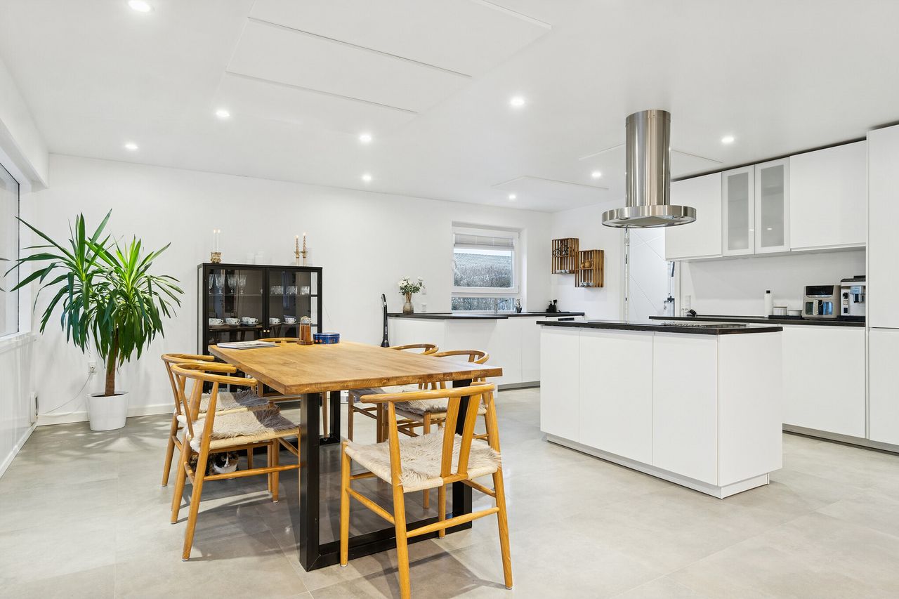 Husets naturlige samlingspunkt er det lyse og indbydende køkken-alrum, hvor et nyere køkken med pænt klinkegulv er åbnet op og skaber en god sammenhæng mellem madlavning og samvær. Herfra er der adgang til en udestue, som på fineste vis binder inde- og udeliv sammen og giver direkte forbindelse til terrasse og have. Den store og lyse stue giver masser af plads til både hverdagsliv og gæster.