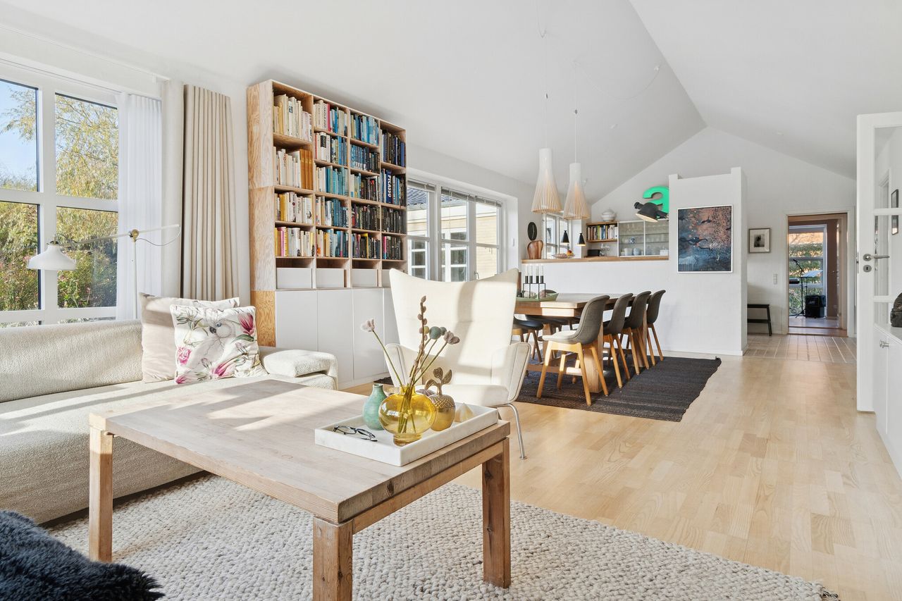 Indenfor er boligens naturlige samlingspunkt det store, åbne opholdsrum med alrum og stue i ét. Her strømmer lyset ind gennem de store vinduespartier, og det åbne kiploft skaber en luftig og imødekommende stemning. Det værelse, der ligger i forlængelse af stuen, er opsat i nyere tid og kan efter ønske nemt fjernes igen, så den oprindelige vinkelstue kan genetableres – perfekt for dem, der ønsker endnu mere opholdsplads og luft. Køkkenet ligger i åben forbindelse med alrummet og fremstår lyst, velindrettet og med god arbejdsplads. De store vinduer giver et skønt udsyn til haven og masser af naturligt lys.