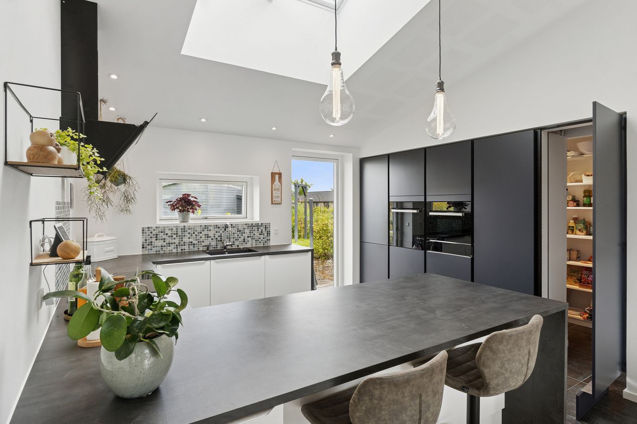 Køkken/alrummet er husets naturlige samlingspunkt – her er der loft til kip, ovenlys og akustiklofter, som sikrer et behageligt indeklima og en luftig atmosfære. Bag den stilrene midnatsblå skabsvæg gemmer sig et praktisk og diskret viktualierum – perfekt til opbevaring.