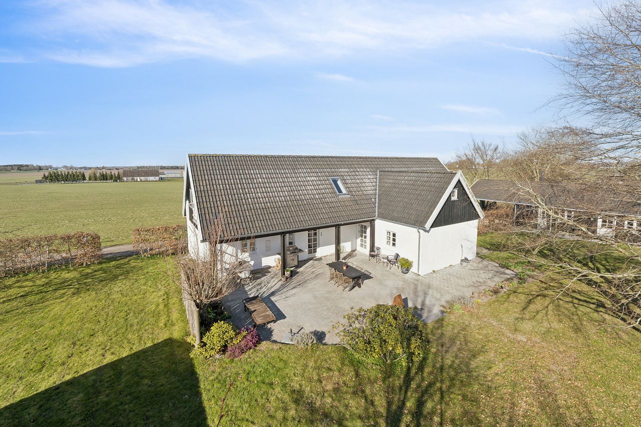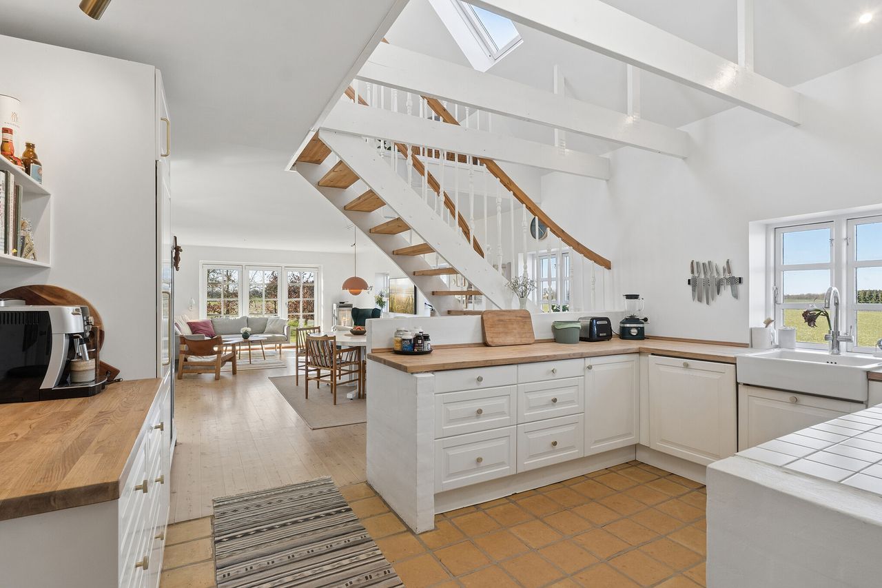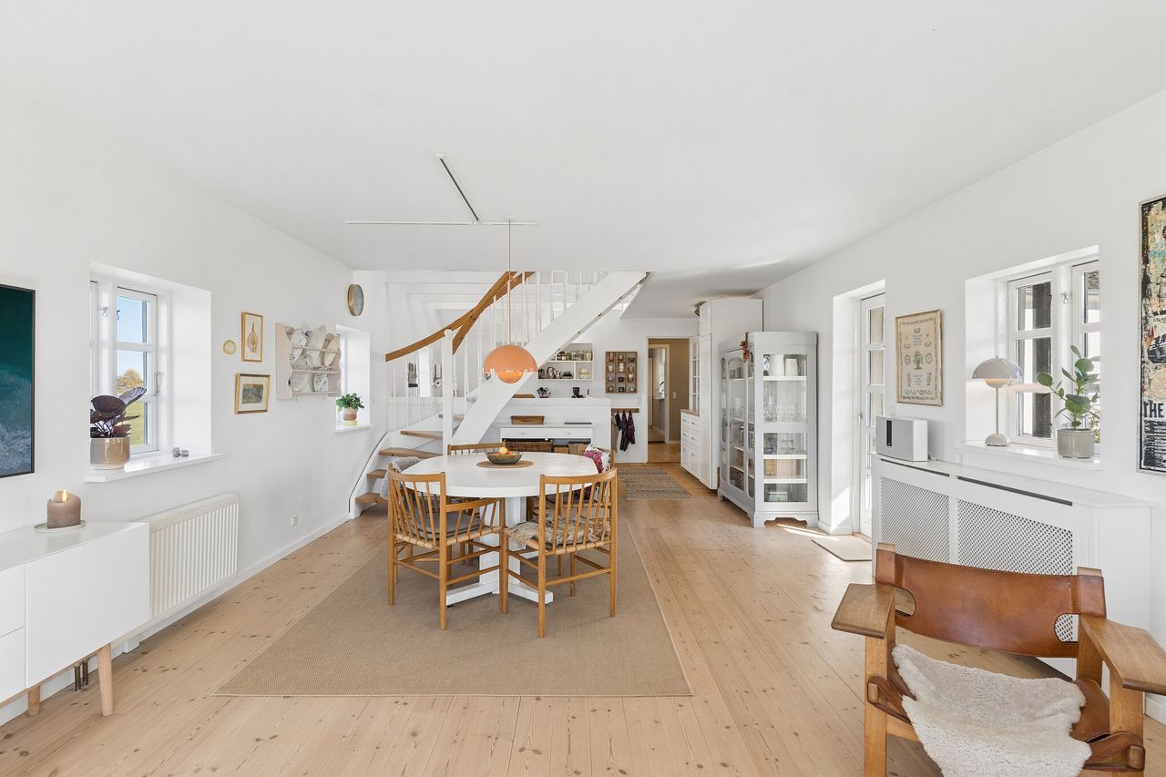 Husets hjerte er det store køkkenalrum, hvor loftet strækker sig til kip og giver rummet en imponerende rummelighed. Fra alrummet kan du nyde udsigten over de omkringliggende marker eller træde ud på den smukke fliseterrasse. En elegant trappe midt i rummet fører dig op til førstesalen, hvor en stor repos med velux vinduer skaber lys og luftighed. Mod øst ligger to gode værelser samt et praktisk depotrum, mens mod vest findes et større værelse. Gennem årene er huset blevet moderniseret med respekt for dets oprindelige sjæl. De stilrene badeværelser fra 2024/2025 og det lyse landkøkken harmonerer perfekt med husets karakter. Alrummets lyse fyrretræsgulve bidrager yderligere til den indbydende atmosfære.