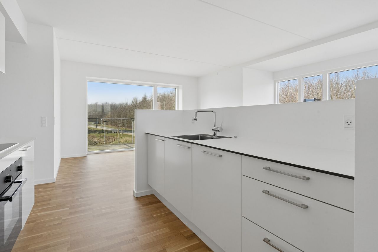 Som gavllejlighed nyder boligen godt af ekstra lysindfald, og de flotte gulv-til-loft-vinduer samt en praktisk karnap bidrager til et helt særligt lys i køkken-alrummet, hvor rummet føles både åbent og indbydende. Boligen rummer tre gode værelser. Det ene værelse ligger i forbindelse med sit eget badeværelse, mens boligens andet badeværelse er praktisk placeret tæt på de to øvrige værelser.