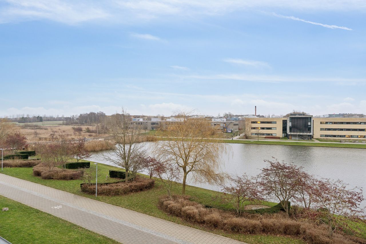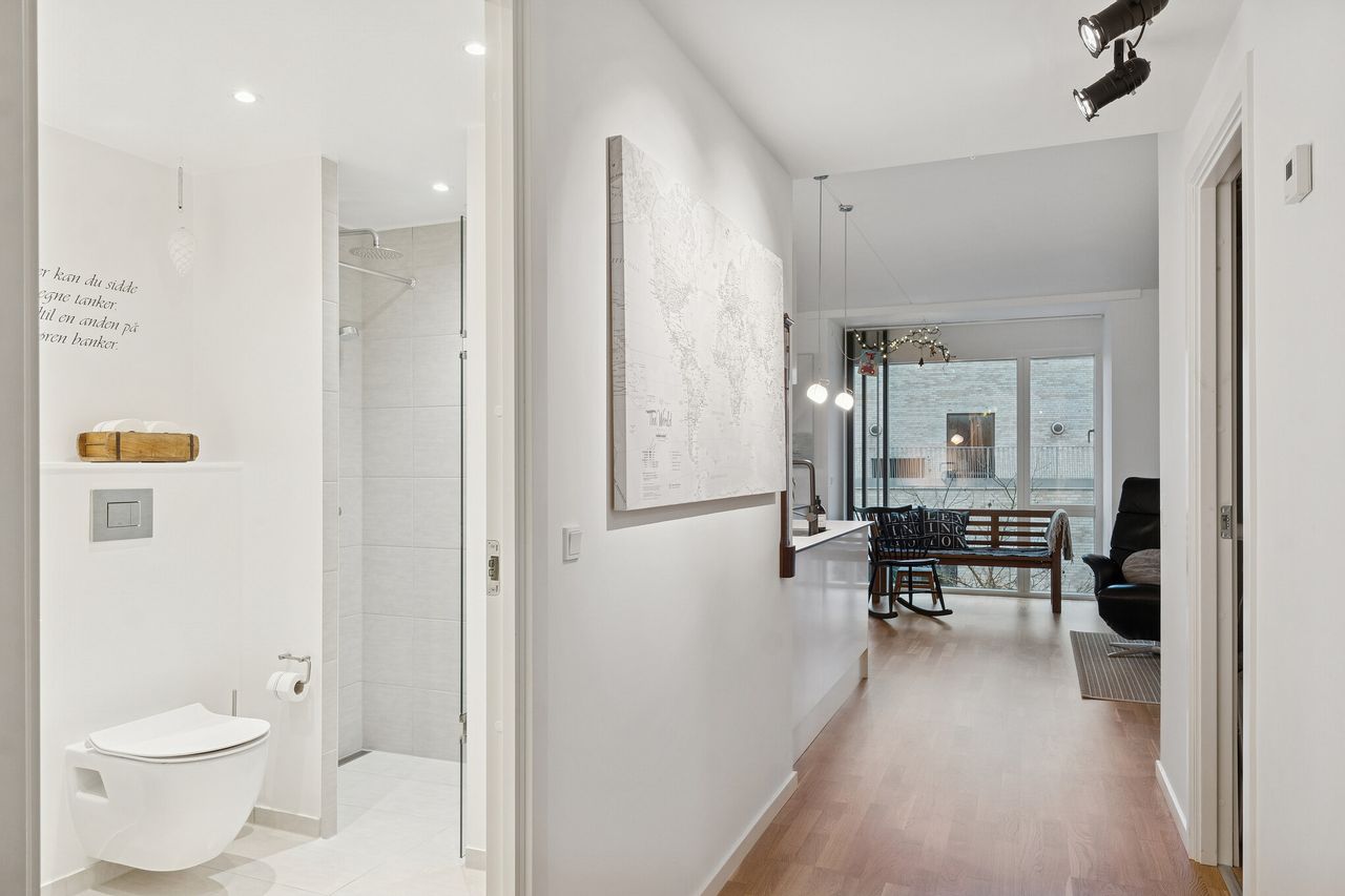 Det stilrene køkken er indrettet med hvide elementer i et tidløst design og god opbevaringsplads. Boligen rummer to gode værelser, hvoraf det ene har en smuk udsigt over søen. Badeværelset er velindrettet med bruseniche, væghængt toilet og vaskesøjle, og derudover findes et praktisk depotrum.