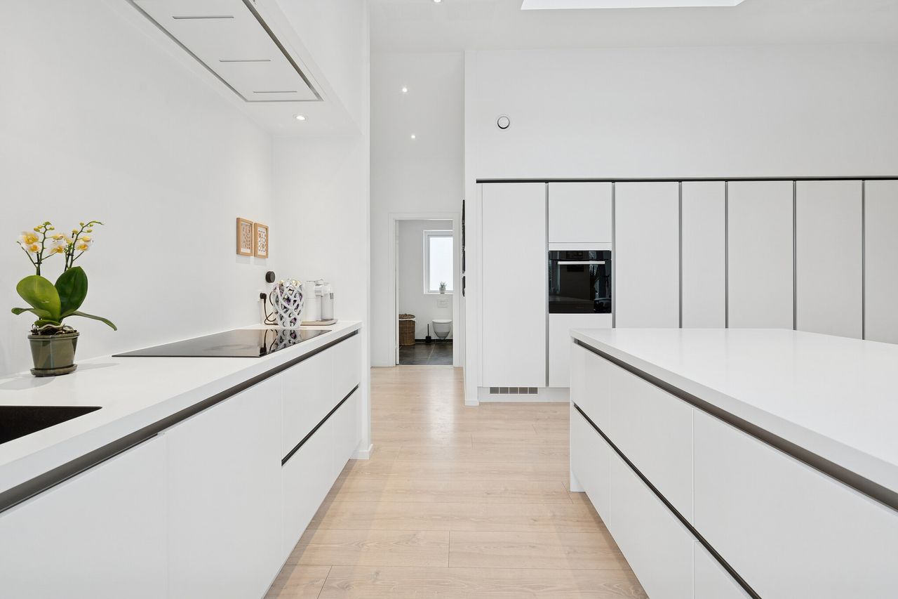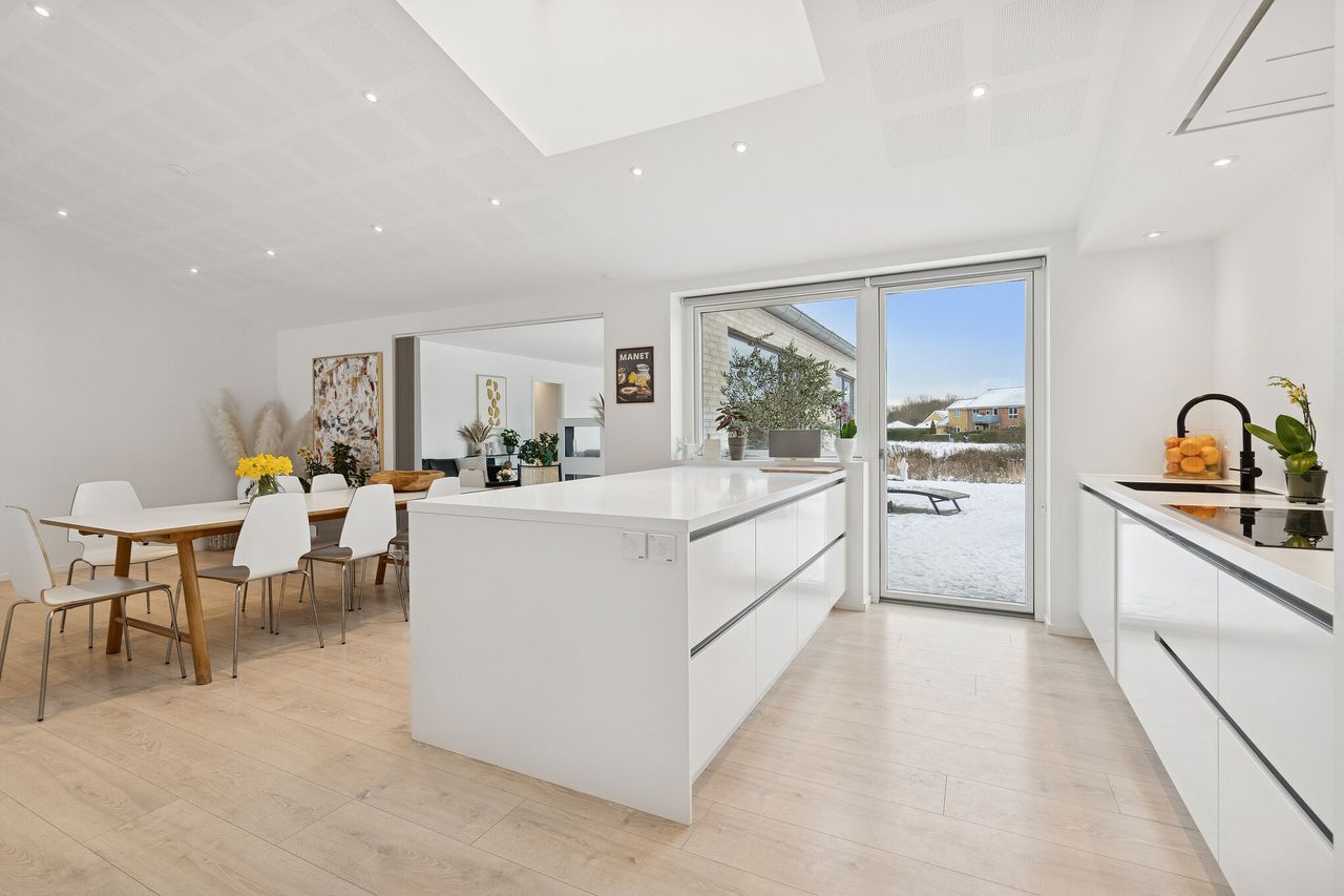 Boligen byder jer velkommen i en rummelig entré med direkte adgang til et funktionelt bryggers med vaskefaciliteter og god opbevaringsplads, som gør hverdagen både praktisk og overskuelig. Herfra træder I videre ind i husets store og lyse køkken-alrum, der udgør hjemmets naturlige samlingspunkt. Det elegante køkken, de akustikregulerende lofter og de markante vinduespartier skaber en rolig og behagelig atmosfære, hvor lys og udsigt til de grønne omgivelser er en integreret del af oplevelsen. I åben forbindelse ligger opholdsstuen, som giver rig plads til både afslapning og samvær.