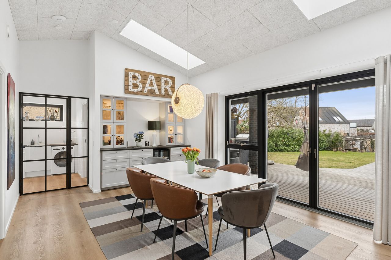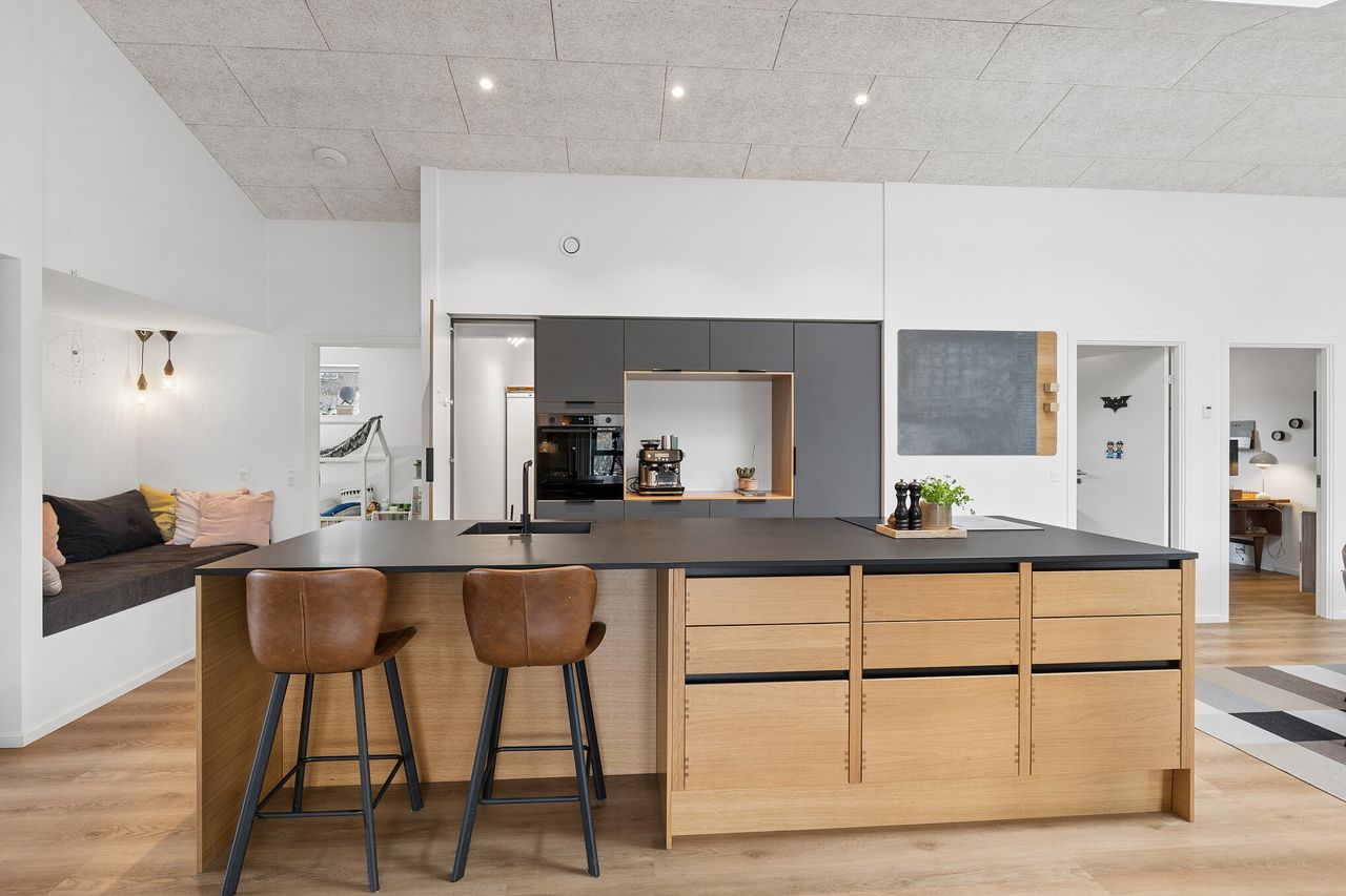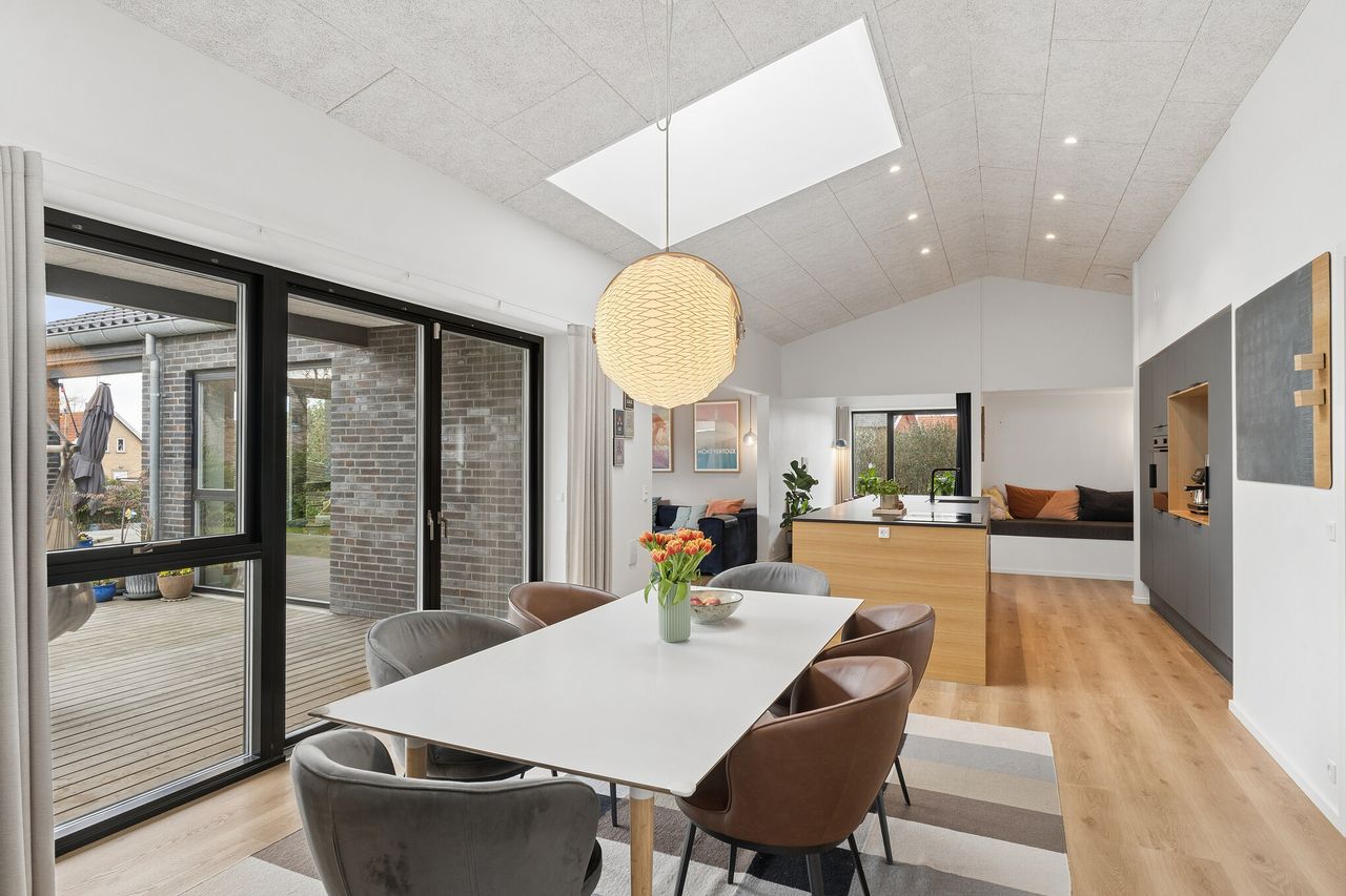 Husets naturlige samlingspunkt er det indbydende køkken/alrum, hvor æstetik og funktionalitet smelter sammen. Herfra er der direkte udgang til en imponerende, vestvendt træterrasse, hvoraf hele 32 m² er overdækket – ideelt til lange sommeraftener og udeliv i læ og skygge.