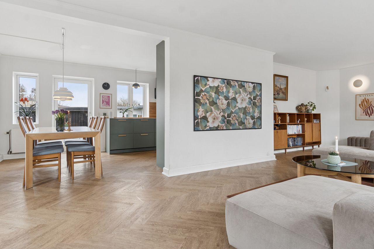 Boligen byder velkommen i en rummelig og indbydende entré med god plads til garderobe. Herfra er der adgang til to værelser samt et lyst og moderne badeværelse med gode materialer og en funktionel indretning, der imødekommer familiens behov. Husets naturlige samlingspunkt er det imponerende køkken-alrum, hvor sildebensgulve, et smukt lysindfald og et moderne køkken skaber en helt særlig atmosfære. Køkkenet byder på gode arbejdsflader og rigelig opbevaringsplads og danner de perfekte rammer for både dagligdagen og hyggelige sammenkomster med familie og venner. Fra køkkenet er der adgang til bryggers og videre til vindfanget, som forbinder boligen med haven og det stemningsfulde terrassemiljø.