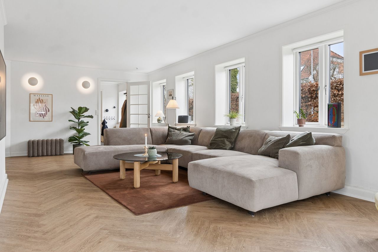 På Sankt Jørgensbjerg ligger denne gennemført opdaterede bolig, hvor oprindelige kvaliteter er nænsomt videreført i et moderne udtryk, der skaber en indbydende og velfungerende ramme om hverdagen. Boligen er løbende forbedret med stor respekt for husets sjæl og fremstår i dag i flot og indbydende stand. Her kan blandt andet nævnes nye vinduer i hele huset, nyt køkken, et installeret blødgøringsanlæg samt en elegant opdateret facade, der tilsammen understreger husets tidsløse arkitektur.