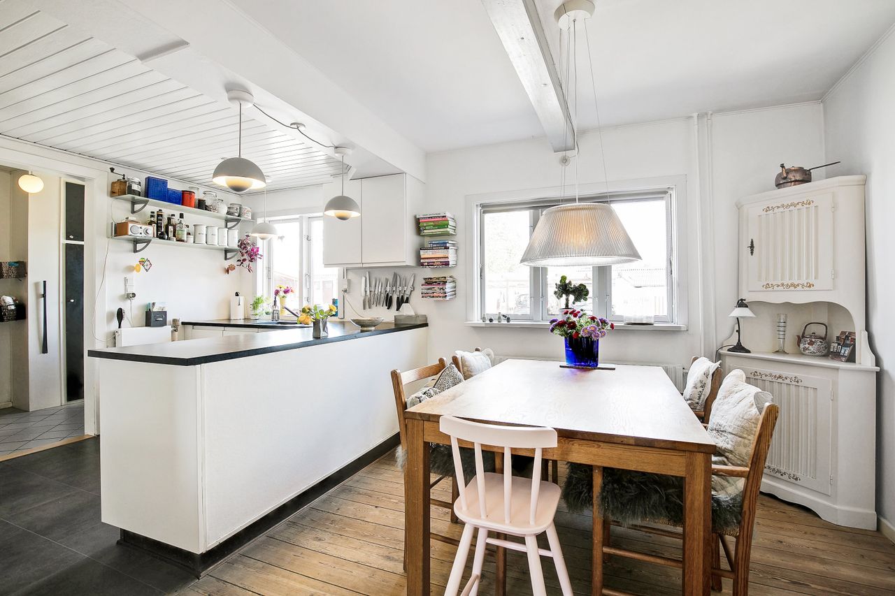 Indenfor er omdrejningspunktet den lyse og imødekommende stue, der har direkte udgang til en skøn, vestvendt have – et lille grønt frirum, hvor aftensolen luner, og hvor der er plads til både blomsterbede, grill og afslapning. Spiseafdelingen ligger i åben forbindelse med stuen, og her er god plads til gæster – der kan nemt dækkes op til 18 personer, når familien samles.
