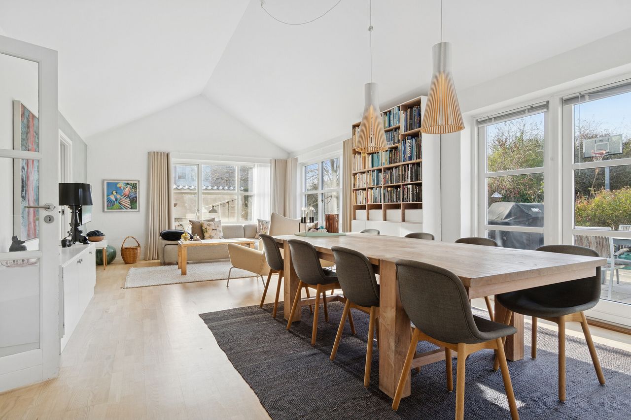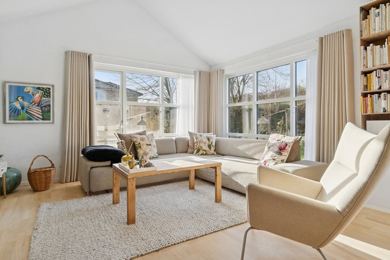 Indenfor er boligens naturlige samlingspunkt det store, åbne opholdsrum med alrum og stue i ét. Her strømmer lyset ind gennem de store vinduespartier, og det åbne kiploft skaber en luftig og imødekommende stemning. Det værelse, der ligger i forlængelse af stuen, er opsat i nyere tid og kan efter ønske nemt fjernes igen, så den oprindelige vinkelstue kan genetableres – perfekt for dem, der ønsker endnu mere opholdsplads og luft. Køkkenet ligger i åben forbindelse med alrummet og fremstår lyst, velindrettet og med god arbejdsplads. De store vinduer giver et skønt udsyn til haven og masser af naturligt lys.
