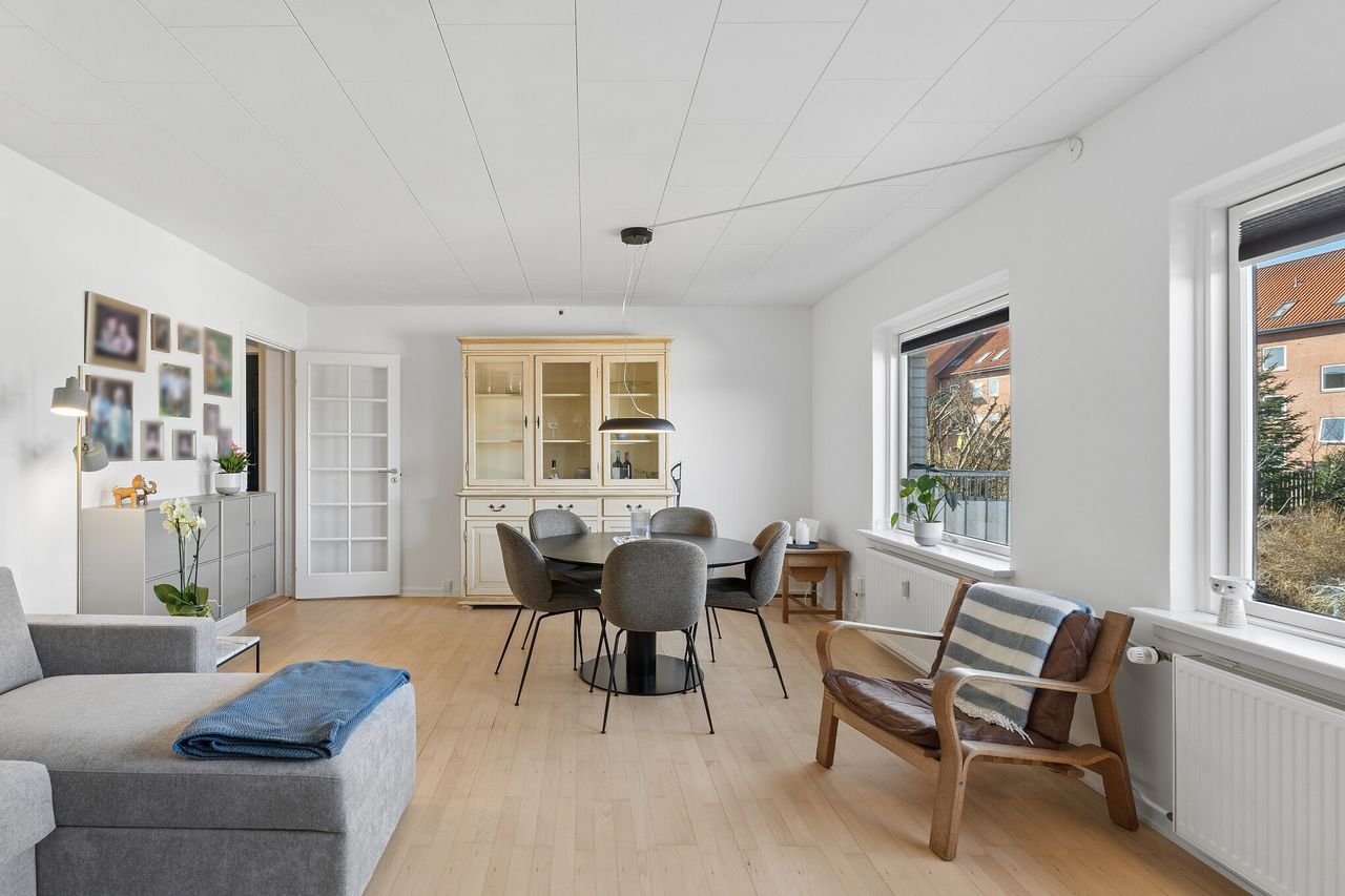 Lejligheden på 73 m² fremstår pænt og moderne istandsat i januar 2026 med hvidmalede filtvægge og akustikpaneler i egetræsfiner. Gulvene er slebet i stue, gang, køkken og soveværelse. Den rummelige opholdsstue har god plads til både spiseafdeling og sofaarrangement, og soveværelset rummer nemt en dobbeltseng på op til 180 cm samt god skabsplads.