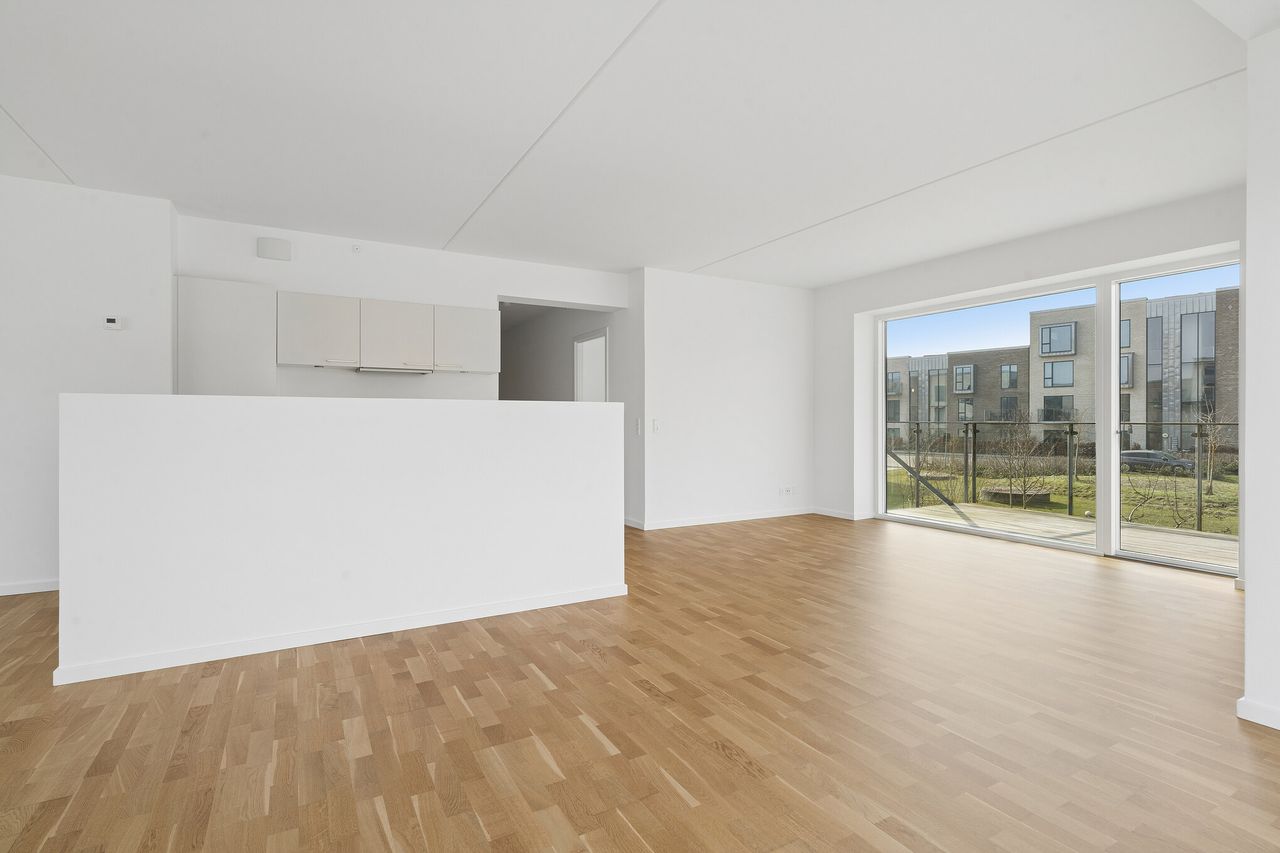 Lejligheden er placeret på 1. sal og byder på hele 130 veldisponerede kvadratmeter i en moderne ejendom fra 2019. Her får I glæde af komfortable faciliteter som ventilationsanlæg og gulvvarme i alle rum, ligesom der er elevator i bygningen, som gør adgangen til boligen både nem og bekvem.