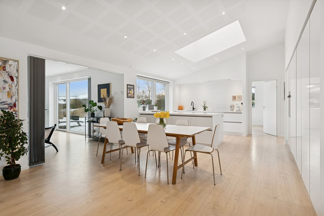 Boligen byder jer velkommen i en rummelig entré med direkte adgang til et funktionelt bryggers med vaskefaciliteter og god opbevaringsplads, som gør hverdagen både praktisk og overskuelig. Herfra træder I videre ind i husets store og lyse køkken-alrum, der udgør hjemmets naturlige samlingspunkt. Det elegante køkken, de akustikregulerende lofter og de markante vinduespartier skaber en rolig og behagelig atmosfære, hvor lys og udsigt til de grønne omgivelser er en integreret del af oplevelsen. I åben forbindelse ligger opholdsstuen, som giver rig plads til både afslapning og samvær.