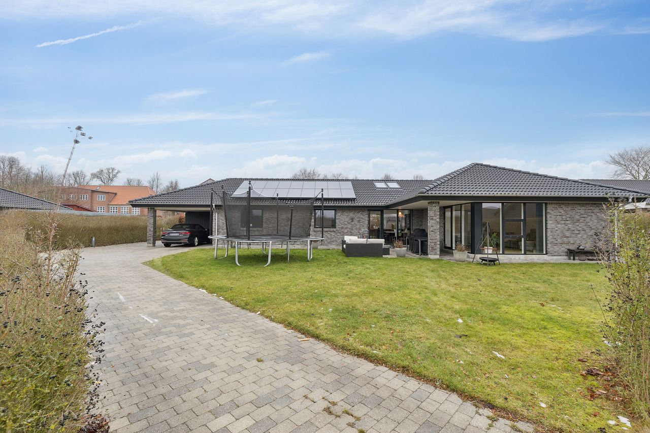 Udvendigt fuldendes ejendommen af en dobbelt integreret carport, der harmonerer smukt med husets arkitektur og materialevalg – helt ned til valget af mursten, som understreger den eksklusive helhed.