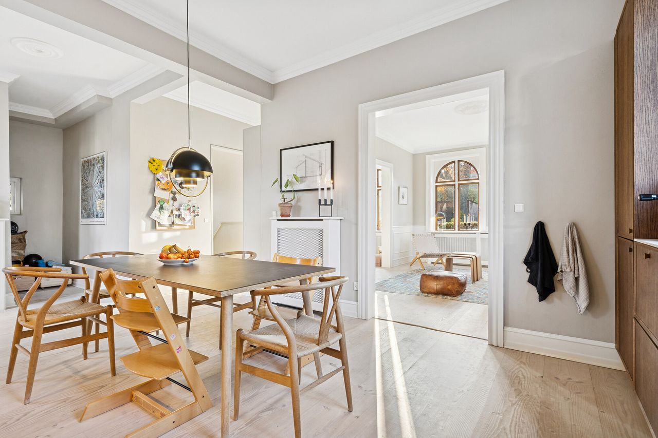 Entréen byder jer ind i et hjem med højt til loftet, stuk, rosetter og høje paneler, der binder stueplanets herskabelige rum smukt sammen. Køkken-alrummet er udformet som familiens naturlige samlingssted med træfronter, messinggreb, gode arbejdsflader og plads til spisebord. Herfra åbner to stuer en-suite sig, den ene indrettet som en hyggelig tv-stue og den anden som kontor eller bibliotek. Et stilrent badeværelse afrunder etagen.
