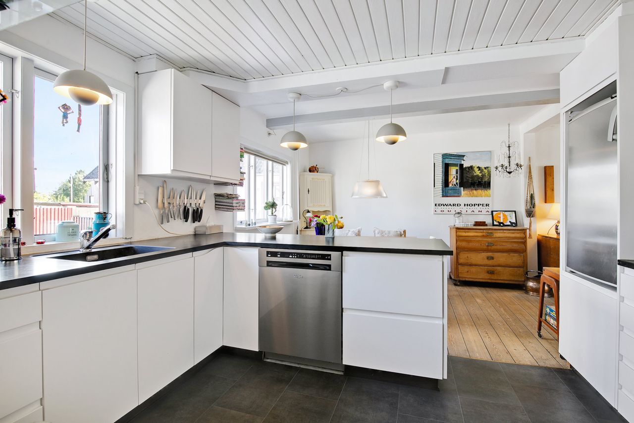 Køkkenet er renoveret i 2018 i en enkel og tidløs stil med hvide fronter og god bordplads – her kan du både bage, eksperimentere og nyde hverdagsmad i rolige omgivelser. I stueplan finder du også entré med adgang til 1. sal. samt et pænt badeværelse med gulvvarme og brusehjørne.